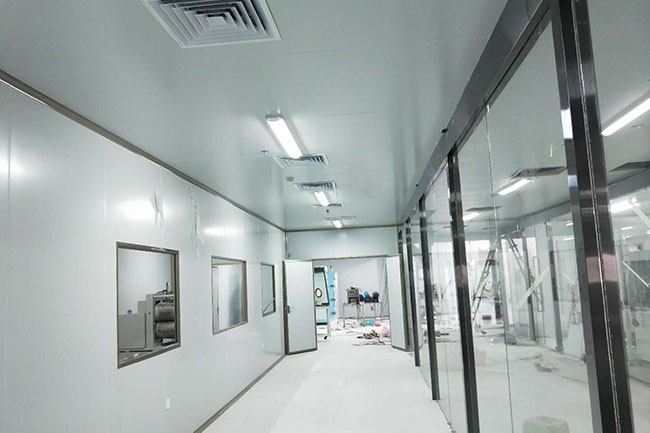 2) 间隔:用双面彩钢保温板围护及间隔,围护面到天花顶;洁净走廊及车间间隔处做通透铝合金半玻璃窗,窗台高900mm, 玻璃厚8mm, 高1200mm,玻璃窗高平门高度(2100mm);铝合金窗料用特制净化材料,45?度斜边,与地面及天花交角做元弧及阴角接口,符合规范及卫生消毒要求。
